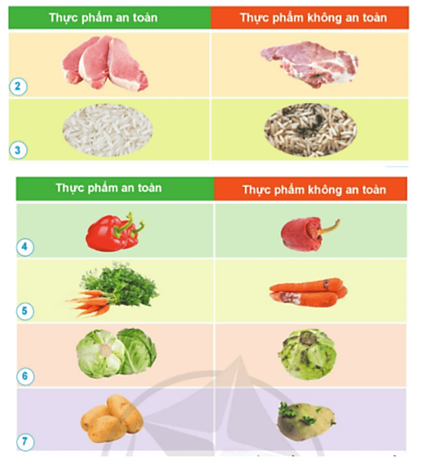 Câu hỏi quan sát 1 trang 81 SGK Khoa học lớp 4: Nêu sự khác nhau giữa thực phẩm an toàn và thực phẩm không an toàn trong mỗi hình dưới đây.