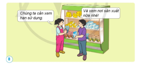 Các bạn trong hình cần chú ý hạn sử dụng và nơi sản xuất để mua được thực phẩm an toàn.