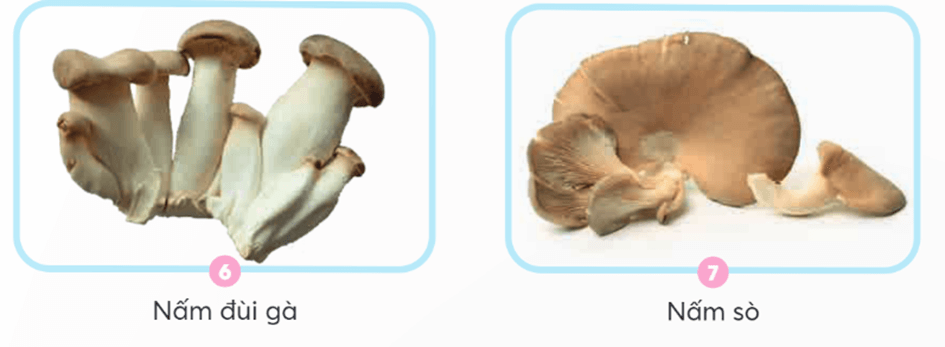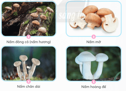 + Kể tên một số nấm được dùng làm thức ăn và chia sẻ về hình dạng, màu sắc của chúng trong các hình dưới đây.