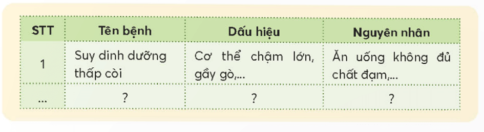 Luyện tập trang 105 SGK Khoa học lớp 4: Hãy tìm hiểu về các bệnh liên quan đến dinh dưỡng qua sách, báo hoặc in - tơ - nét và lập bảng theo gợi ý sau: