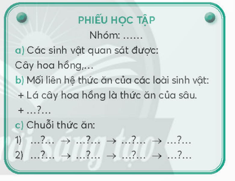 + Vẽ, dán hình hoặc viết tên các sinh vật lên mỗi thẻ bìa theo mối liên hệ của một chuỗi thức ăn.