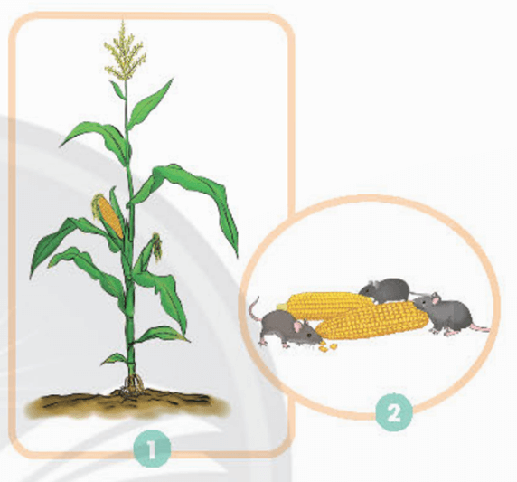 + Cây ngô và con chuột trong hình 1 và hình 2 có mối liên hệ với nhau là: Cây ngô ở hình 1 là thức ăn của con chuột ở hình 2.