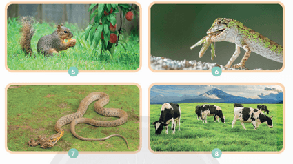 + Quan sát và cho biết thức ăn của mỗi con vật trong các hình sau.