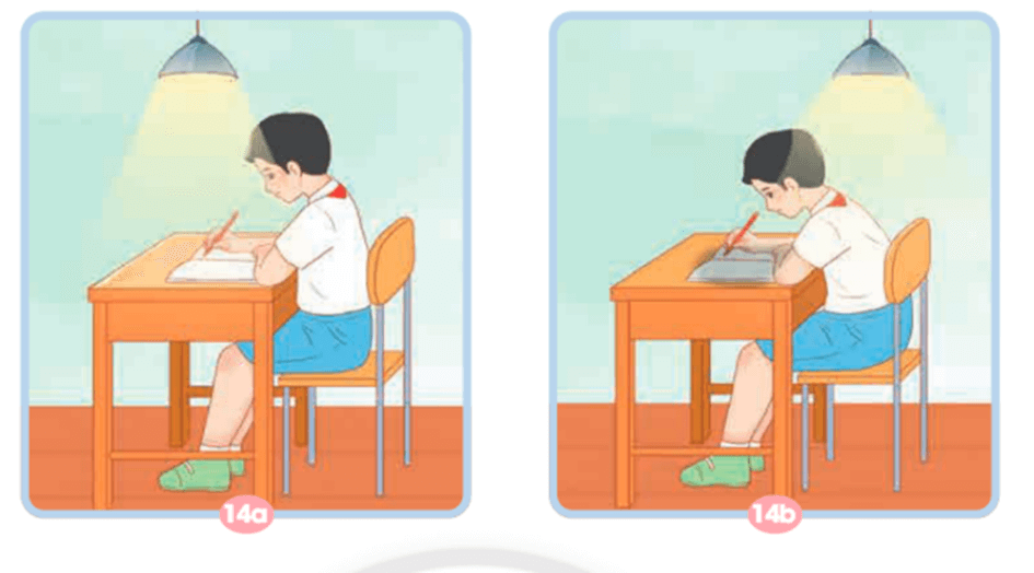 + Bạn ở hình 14a có tư thế ngồi đúng và có ánh sáng thích hợp để học tập vì bạn có tư thế ngồi thẳng, không bị khom lưng, bóng đèn ở phía trước cung cấp đầy đủ ánh sáng cho bạn học bài.