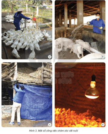 Hoạt động trang 66 SGK Khoa học 4: Quan sát hình 3 và nêu các công việc chăm sóc vật nuôi trong hình. Giải thích vì sao cần thực hiện các công việc chăm sóc đó.