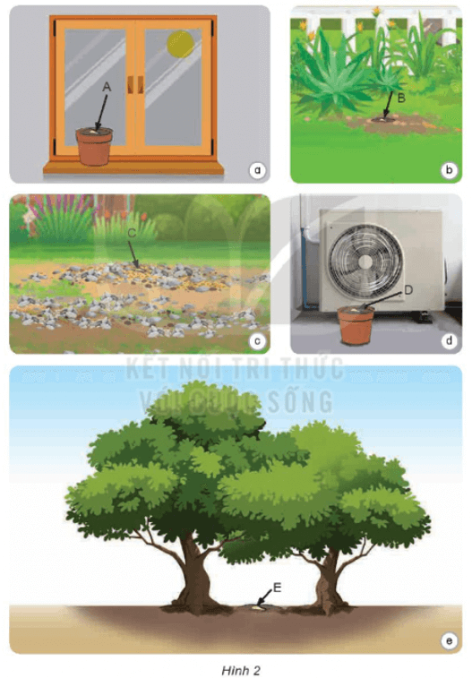 Câu hỏi 2 trang 69 SGK Khoa học 4: Các hạt giống một loại cây gieo vào các vị trí A, B, C, D, E như hình 2 được cung cấp đầy đủ nước và hạt nảy mầm thành cây con, hãy dự đoán: