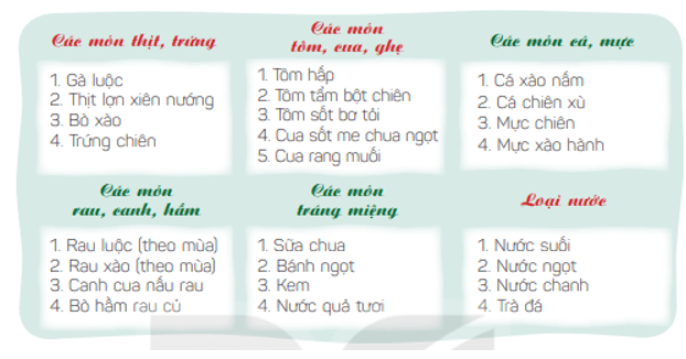 Hoạt động 2 trang 98 SGK Khoa học 4: Dựa vào bảng “thực đơn” gợi ý, hãy xây dựng một số bữa ăn có lợi cho sức khoẻ, phòng tránh một trong các bệnh: suy dinh dưỡng thấp còi, thiếu máu thiếu sắt, thừa cân béo phì.