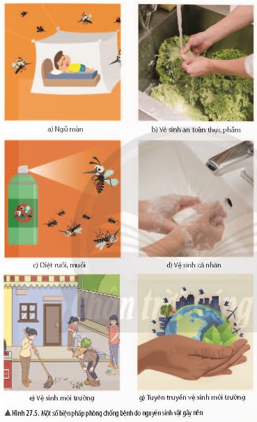 Quan sát hình 27.5, kết hợp với thông tin thực tế, em hãy nêu một số biện pháp phòng chống bệnh do nguyên sinh vật gây ra.