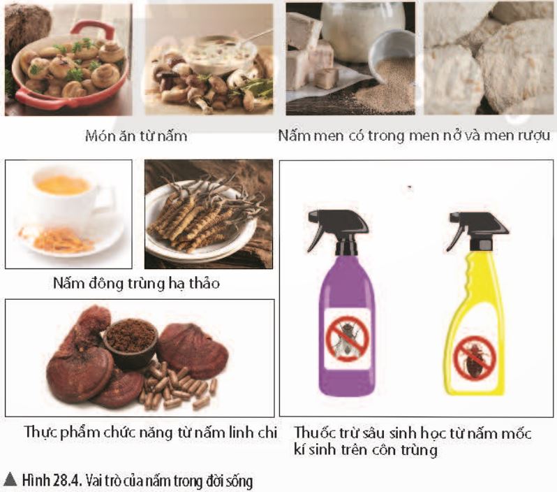 Từ thông tin gợi ý trong hình 28.4, em hãy nêu vai trò của nấm đối với đời sống con người.