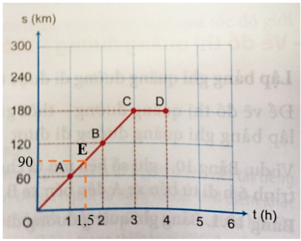 Lấy điểm t = 1,5 (h) kẻ song song với trục Os cắt đoạn thẳng nằm nghiêng OC tại E. Tiếp đó, từ E kẻ song song với trục Ot cắt trục Os tại vị trí 90km.