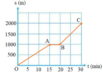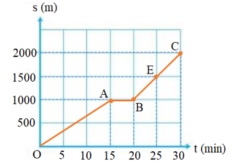 Lúc 6 h sáng, bạn A đi bộ từ nhà ra công viên để tập thể dục cùng các bạn. Trong 15 min đầu, A đi thong thả được 1000 m thì gặp B. A đứng lại nói chuyện với B trong 5 min. Chợt A nhớ ra là các bạn hẹn mình bắt đầu tập thể dục ở công viên vào lúc 6 h 30 min nên vội vã đi nốt 1000 m còn lại và đến công viên vào đúng lúc 6 h 30 min.
