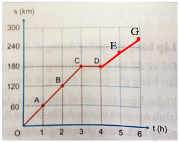 Xác định các điểm E và G lần lượt ứng với quãng đường đi được sau 5 h và 6 h và vẽ các đường nối hai điểm D và E, hai điểm E và G trong Hình 10.2. Nhận xét về các đường nối này.
