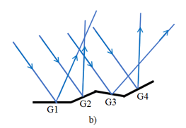 Hình 16.3b: Các tia sáng tới song song bị phản xạ qua gương không phẳng cho các tia phản xạ theo các hướng khác nhau.