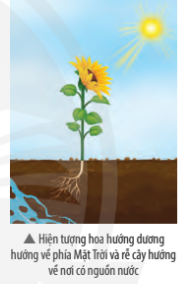 Trong hình bên, rễ của cây hướng dương hướng về nguồn nước, còn hoa của nó luôn hướng về phía Mặt Trời. Hãy giải thích hiện tượng đó.