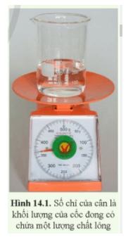+ Đổ lượng chất lỏng cần xác định khối lượng riêng vào cốc đong. Dùng cân xác định tổng khối lượng m2 của cốc đong và lượng chất lỏng (hình 14.1).