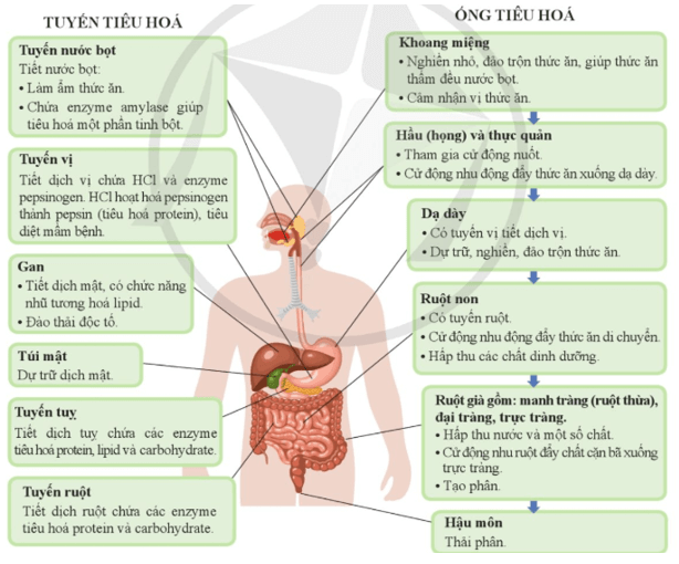 - Sự phối hợp của các cơ quan trong quá trình tiêu hóa và hấp thu chất dinh dưỡng: Thức ăn di chuyển qua ống tiêu hóa, trải qua quá trình tiêu hóa cơ học (thức ăn được nghiền nhỏ, đảo trộn) và tiêu hóa hóa học (thức ăn được biến đổi nhờ sự xúc tác của enzyme) thành các chất đơn giản. Những chất dinh dưỡng được hấp thu vào máu và mạch bạch huyết ở ruột non. Những chất không được tiêu hóa và hấp thu được thải ra ngoài qua hậu môn.