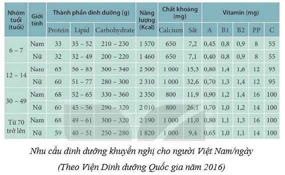 - Chế độ dinh dưỡng hợp lí cần phù hợp với nhu cầu cơ thể (tùy theo độ tuổi, giới tính, mức độ hoạt động của cơ thể, tình trạng bệnh tật). Căn cứ vào đó, học sinh xây dựng chế độ dinh dưỡng hợp lí cho bản thân và những người trong gia đình.