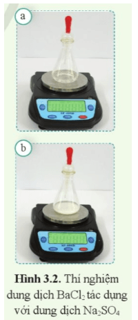 Bước 2: Bóp nút cao su cho dung dịch Na2SO4 chảy xuống bình (hình 3.2b). Quan sát dấu hiệu của phản ứng xảy ra. Ghi chỉ số khối lượng hiện trên mặt cân (kí hiệu là mB).