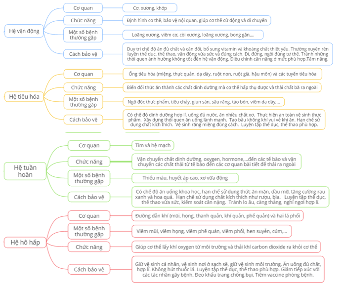 Bài tập 1 trang 178 KHTN 8: Nêu các cơ quan, chức năng, một số bệnh thường gặp và cách bảo vệ các hệ cơ quan trong cơ thể người theo gợi ý dưới đây: