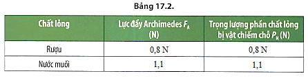 Câu hỏi thảo luận 6 trang 87 KHTN lớp 8: Từ Bảng 17.2, hãy cho biết độ lớn lực đẩy Archimedes của chất lỏng tác dụng lên vật thay đổi như thế nào với các chất lỏng có khối lượng riêng khác nhau.