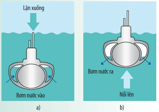 - Để tàu ngầm lặn xuống sâu thì người ta bơm nước vào khoang chứa nước ở trong tàu làm tăng trọng lượng của tàu ngầm cho tới khi lớn hơn lực đẩy của nước và tàu xuống tới độ sâu phù hợp yêu cầu thì dừng bơm nước.