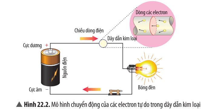 Câu hỏi thảo luận 1 trang 103 KHTN lớp 8: Quan sát Hình 22.2 và cho biết các electron tự do bị cực nào của pin đẩy, bị cực nào của pin hút. Từ đó chỉ ra chiều chuyển dời của các electron tự do trong dây dẫn kim loại.