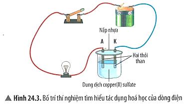 Chuẩn bị: nguồn điện (pin loại 6 V), bóng đèn nhỏ (loại 3 V), bình thủy tinh có hai thỏi than cắm vào nắp, dung dịch copper (II) sulfate, công tắc và các đoạn dây nối.
