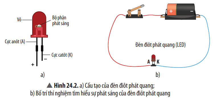 Bước 1: Lắp mạch điện như Hình 24.2 (chú ý nối cực anôt (anode) A của đèn với cực dương của pin, nối cực catôt (cathode) K với cực âm của pin).