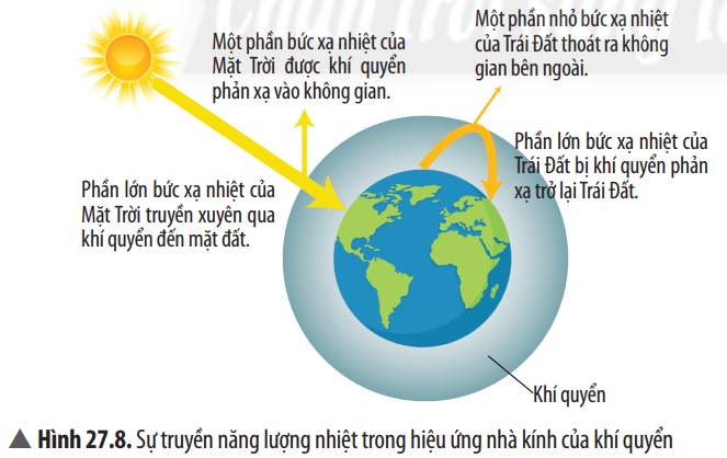 Câu hỏi thảo luận 6 trang 127 KHTN lớp 8: Mô tả sự truyền năng lượng nhiệt trong hiệu ứng nhà kính khí quyển (Hình 27.8).