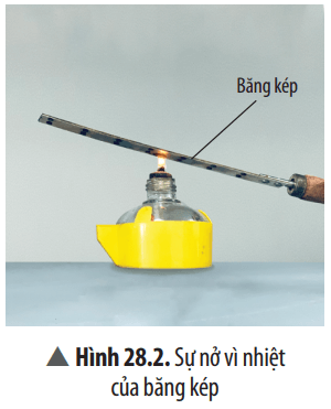 Bước 1: Hơ đều băng kép trên ngọn lửa đèn cồn trong khoảng 3 – 4 phút (Hình 28.2). Quan sát băng kép.