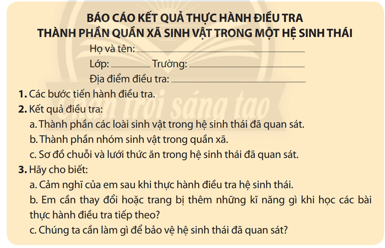 Báo cáo kết quả thực hành trang 214 KHTN lớp 8: Báo cáo kết quả thực hành điều tra thành phần quần xã sinh vật trong một hệ sinh thái