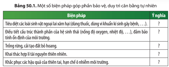 Câu hỏi thảo luận 3 trang 216 KHTN lớp 8: Cho biết ý nghĩa của một số biện pháp được sử dụng để bảo vệ, duy trì cân bằng tự nhiên được nêu trong Bảng 50.1.