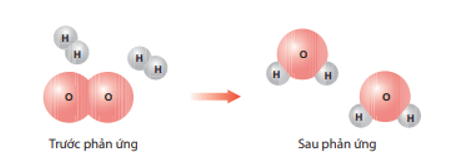 Bài 1 trang 44 Khoa học tự nhiên 8: Hình dưới đây là sơ đồ minh hoạ phản ứng giữa các phân tử hydrogen (H2) và oxygen (O2) tạo ra nước (H2O).