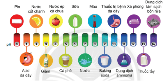 Bài 5 trang 76 Khoa học tự nhiên 8: Hình vẽ sau đây giới thiệu các giá trị pH của một số sản phẩm hàng ngày: