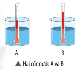 Bài tập 1 trang 133 KHTN lớp 8: Nước trong hai cốc A và B có thể tích bằng nhau và nhiệt độ được biểu thị bởi nhiệt kế trong hình bên.