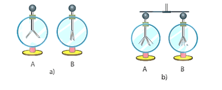Có hai điện nghiệm, điện nghiệm A được tích điện nên hai lá kim loại xòe ra; điện nghiệm B không tích điện nên hai lá kim loại cụp lại (Hình a). Nối hai quả cầu của hai điện nghiệm, hiện tượng xảy ra: hai lá kim loại của điện nghiệm A giảm độ xòe, hai lá kim loại của điện nghiệm B xòe ra (Hình b). Kết quả thí nghiệm chứng tỏ điều gì?