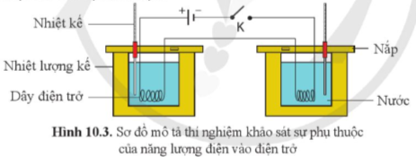 Thí nghiệm khảo sát sự phụ thuộc của năng lượng điện vào điện trở được mô tả ở sơ đồ hình 10.3. Dụng cụ thí nghiệm gồm: hai nhiệt lượng kế đựng hai lượng nước giống nhau, hai dây điện trở khác nhau nhúng trong nước được mắc nối tiếp với nguồn điện. Khi cho dòng điện chạy qua, hai điện trở sẽ nóng lên và toả nhiệt. Kết quả đo trong cùng khoảng thời gian cho thấy năng lượng nhiệt đo được tỉ lệ với điện trở. Từ đó, ông rút ra kết luận: Năng lượng điện tỉ lệ thuận với điện trở của vật dẫn điện.