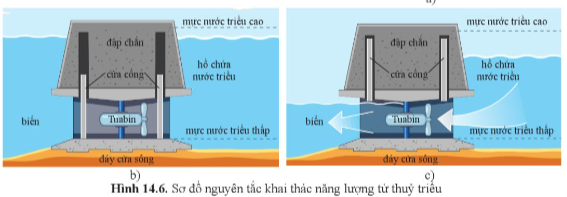 Dựa vào hình 14.6, mô tả sơ lược nguyên tắc khai thác năng lượng từ thuỷ triều.