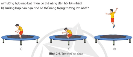 Trong trò chơi bạt nhún ở hình 2.6, bạn nhỏ nhấn chân lên mặt bạt làm mặt bạt biến dạng tích trữ năng lượng dưới dạng thế năng đàn hồi. Mặt bạt đàn hồi trở lại trạng thái cũ, đẩy bạn nhỏ lên cao, thế năng đàn hồi chuyển hoá thành động năng của bạn nhỏ và sau đó động năng lại chuyển hoá thành thế năng trọng trường của bạn đó.