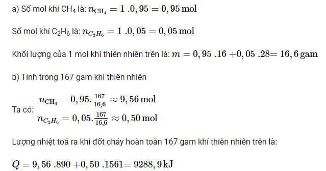 b) Tính lượng nhiệt toả ra khi đốt cháy hoàn toàn 167 gam khí thiên nhiên trên. Biết rằng, lượng nhiệt toả ra khi đốt cháy hoàn toàn 1 mol CH4 và 1 mol C2H6 lần lượt là 890 kJ và 1 561 kJ.