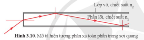 Tìm hiểu thêm trang 23 KHTN 9: Sợi quang được ứng dụng trong nội soi, trang trí, truyền thông tin,... Sợi quang có thể cho ánh sáng đi từ đầu này đến đầu bên kia mà hầu như không giảm cường độ sáng. Tính chất này có được là do khi tia sáng truyền trong sợi quang nếu gặp lớp vỏ sẽ bị phản xạ toàn phần (hình 3.10). Nếu phần lõi sợi quang có chiết suất n1, và lớp vỏ có chiết suất n2 thì các chiết suất này phải có đặc điểm gì?