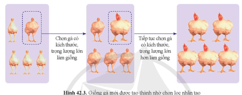 - Quá trình chọn lọc nhân tạo ở gà: Ban đầu, trong quần thể gà có nhiều biến dị về tính trạng kích thước và trọng lượng cơ thể. Con người đã chủ động chọn lọc những con gà có kích thước, trọng lượng lớn để làm giống, đồng thời, loại bỏ những có gà có kích thước, trọng lượng nhỏ hơn. Trải qua nhiều thế hệ, đặc điểm kích thước và trọng lượng cơ thể lớn ngày càng được tăng cường và giống gà có kích thước và trọng lượng lớn được tạo thành.