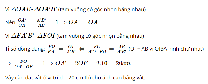 => Vật cách thấu kính d = 2f thì ảnh cách thấu kính d' = 2f và ảnh có độ cao bằng vật.
