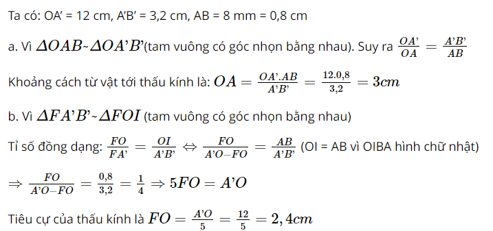 Ta có: AB = 8 mm = 0,8 cm, OA' = 12 cm, A'B' = 3,2 cm. Tìm OA, OF.