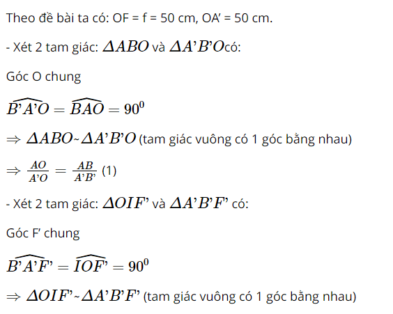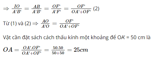 Ta có: OF = 50 cm, OA' = 50 cm. Tìm OA.