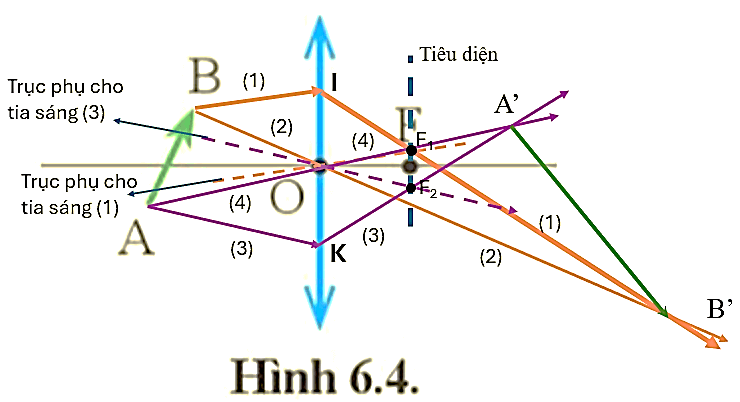 Câu hỏi 2 trang 34 KHTN 9: Tìm hiểu cách vẽ ảnh của vật sáng AB không vuông góc với trục chính của thấu kính ở hình 6.4.