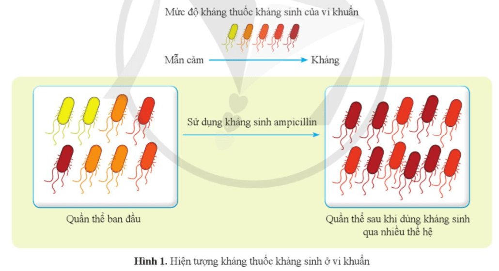 b) Giải thích sự tiến hóa của quần thể vi khuẩn theo quan điểm tiến hóa tổng hợp hiện đại: Quần thể vi khuẩn có nhiều đột biến được phát sinh quy định mức độ kháng kháng sinh. Khi sử dụng kháng sinh, chọn lọc tự nhiên tác động theo hướng giữ lại các vi khuẩn mang allele quy định tính kháng kháng sinh cao và đào thải các vi khuẩn mang allele quy định mẫn cảm với kháng sinh hoặc có tính kháng kháng sinh thấp. Qua thời gian, các vi khuẩn mang allele quy định tính kháng kháng sinh cao được sống sót, sinh sản nhanh tạo thành quần thể vi khuẩn có tính kháng kháng sinh cao thay thế cho quần thể vi khuẩn mẫn cảm với kháng sinh ban đầu.