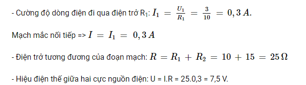 Bài 1 trang 56 KHTN 9: Hai điện trở R1=10Ω,R2=15Ω mắc nối tiếp với nhau và mắc vào hai cực của nguồn điện. Hiệu điện thế giữa hai đầu điện trở R1 là 3 V. Tính hiệu điện thế giữa hai cực nguồn điện.