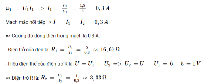 Bài 2 trang 56 KHTN 9: Cho một đèn có ghi 5 V – 1,5 W và nguồn điện cung cấp hiệu điện thế không đổi 6 V. Cần mắc nối tiếp bóng đèn với một điện trở R vào hai cực của nguồn điện để đèn sáng bình thường. Tính điện trở của đèn, điện trở R và cường độ dòng điện trong mạch.