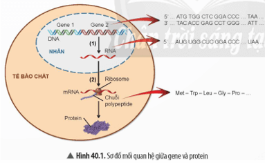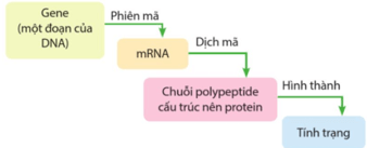- Mối quan hệ giữa gene và protein trong việc biểu hiện các tính trạng ở sinh vật: Trình tự các nucleotide trên mạch đơn của gene (DNA) quy định trình tự các nucleotide trên mRNA thông qua quá trình phiên mã, trình tự các nucleotide trên mRNA quy định trình tự amino acid trên chuỗi polypeptide (protein) thông qua quá trình dịch mã, protein biểu hiện thành tính trạng của cơ thể. Như vậy, trong tế bào, gene không trực tiếp hình thành tính trạng mà phải thông qua sự tương tác giữa các phân tử mRNA, protein và có thể chịu tác động của các nhân tố môi trường.
